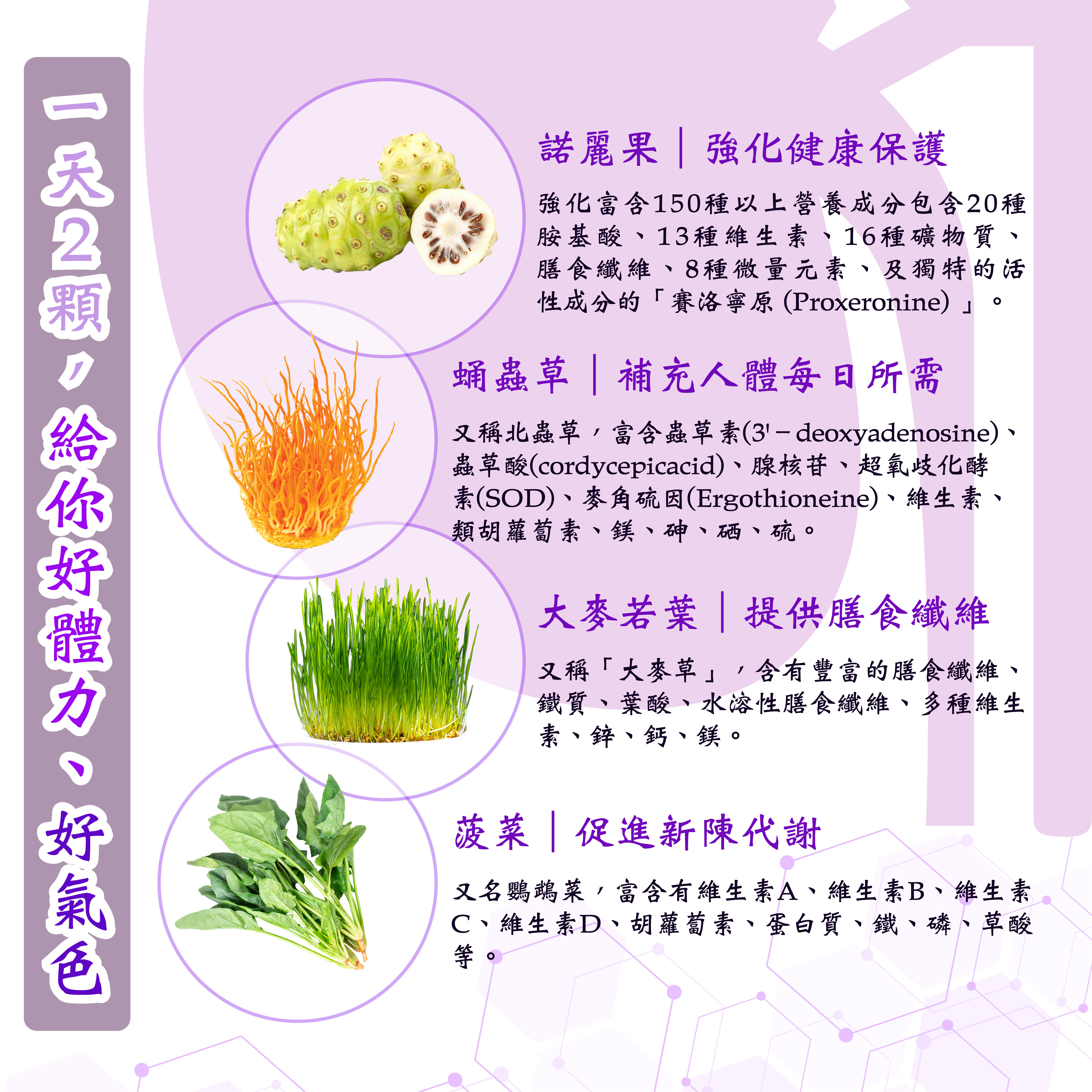 ◆ 諾麗果+蟲草+大麥若葉複方配方,一次補足每日元氣與營養